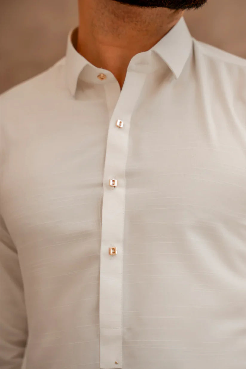 Snow White ensemble is a sophisticated blend of classic appeal. With a shirt collar and placket adorned with square gold metallic buttons, the ensemble introduces subtle opulence to the rich white fabric. The cut cuff with a rivet detail on the sleeve and front placket adds a contemporary flourish and creates an elegant focal point. Finished with a round hem, the kameez ensures a graceful silhouette.